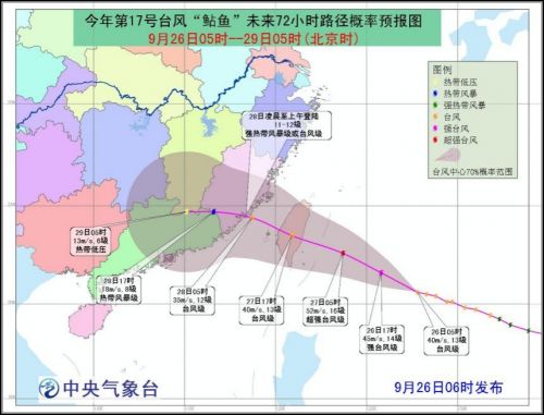 中央气象台9月26日06时发布台风黄色预警:今年第17号台风“鲇鱼”的中心今天(26日)早晨5点钟位于我国台湾省台东市东偏南方大约730公里的西北太平洋洋面上,就是北纬20.6度,东经127.8度,中心附近最大风力有13级(40米/秒),中心最低气压960百帕,七级风圈半径300~380公里,十级风圈半径160~180公里,十二级风圈半径60~80公里。