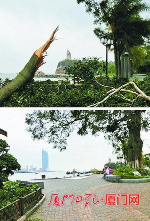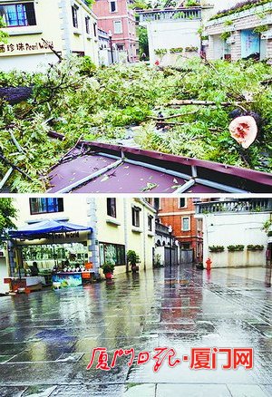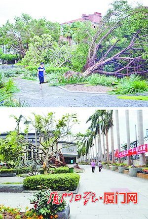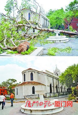 9月15日,“莫兰蒂”正面袭厦。这是1949年以来登陆闽南地区的最强台风,孤悬海上的鼓浪屿同样遭受重创,市政绿化、市容面貌及旅游设施均遭到较大破坏,加之鼓浪屿区域的特殊性,大型机械无法上岛,道路狭窄曲折,灾后恢复难度更甚于别处。