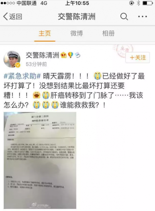 爱帮人的好警察陈清洲被查出肝癌 发微博:谁能救救我