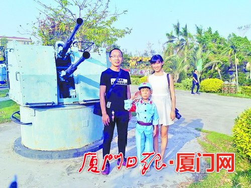 身穿特意买来的红军军装,戴着红色袖标,来自集美的七岁男孩俞碧程架势十足,一会儿在战地观光园的大炮前摆上开炮的架势,一会正步往前走,活脱脱一个小红军模样。碧程爸爸徐光荣告诉记者,儿子是在为新中国67岁生日拍摄一个视频,为此,他们一家专门从集美赶到大嶝岛的战地观光园来拍摄。“这里的背景挺好的,有大炮有地道,很符合我们想要表达的东西。”徐光荣说。这是徐光荣第三次来战地观光园了,徐光荣说,他很喜欢这里,绿树很多又很安静,但受上次台风影响,树少了很多,多少让他感觉遗憾。而说到儿子小碧程,他充满自豪。别看碧程才7岁,人家已经是“网红”了:和赵文卓搭过戏,和王迅斗过舞,担当男一号的戏就有6部。而此次来这里拍摄视频,还是小碧程的想法。