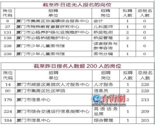 从招聘单位看,厦门市信息中心最“红”,其“产业项目管理”和“综合管理”两个职位的报名人数都已突破200人。