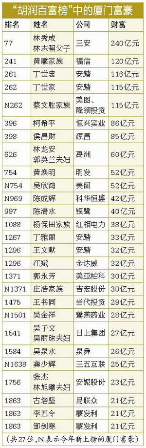 胡润百富榜首现厦门80后 林秀成父子失守福建首富