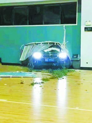 厦门一司机将油门当刹车 宝马车撞进篮球馆
