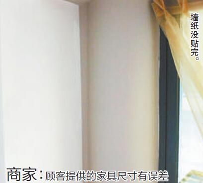 陈先生说,“对方要赶工期,在橱子、柜子等家具进场前就测量了壁纸。测量师傅是根据顾客提供的家具尺寸进行计算的。比如顾客说,这个位置要摆放一个10米宽的柜子,师傅就空出10米,结果实际上柜子只有8米宽,这就产生了2米的误差。”