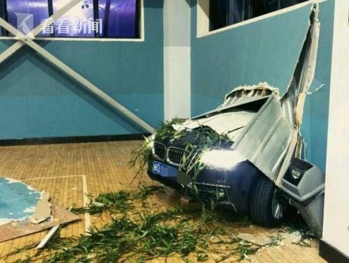 附近的群众说,事发当时这辆黑色宝马轿车在篮球馆旁边的停车场内处于启动状态,不知什么原因突然车子就向前冲去,撞翻了地上的石墩和盆栽,紧接着又撞向篮球馆的外墙,“砰”的一声,轿车车头就冲进了篮球馆内。