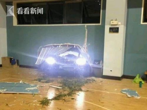 厦门宝马车突然破墙冲进篮球馆 篮球小哥神躲避