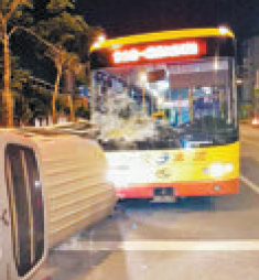 面包车侧翻撞坏公交车。