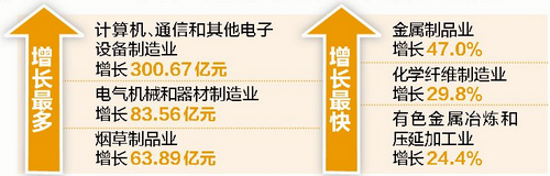 按国民经济行业划分,在35个工业行业中,实现增加值增长的有21个行业,也就是说有六成行业保持增长。其中,金属制品业、化学纤维制造业、有色金属冶炼和压延加工业增长最快,增加值分别增长47.0%、29.8%和24.4%。计算机、通信和其他电子设备制造业,电气机械和器材制造业,烟草制品业,则分别实现工业增加值300.67亿元、83.56亿元、63.89亿元,这三大行业几乎占据了全市规模以上工业增加值的半壁江山,合计占比达到48.0%。