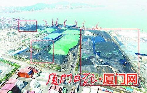 市环境监察支队出动无人机航拍,发现湖里石湖山码头堆场防尘网在台风中受损,部分煤堆场未覆盖(图中红框处)。