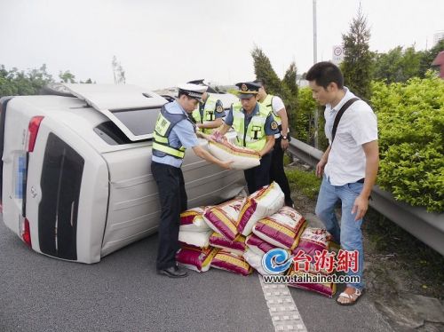 面包车应该载人,怎么能“吃”米?23日下午,一部“吃”了大米的面包车,在高速公路上翻了。