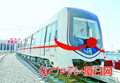时尚流线形车身、六辆编组铝合金车体、身披大红彩带,昨日上午,厦门地铁1号线首列车辆正式对外亮相,接车仪式在厦门北车辆基地举行,中车唐山公司领导向副市长李辉跃递交地铁车钥匙,完成接车。
