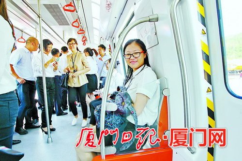 10月30日,厦门地铁首辆列车抵达。地铁运营美女开心祝福。