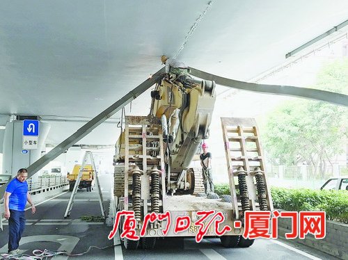 厦门一货车载着挖掘机钻高架桥 超高超载撞断排水管致堵车