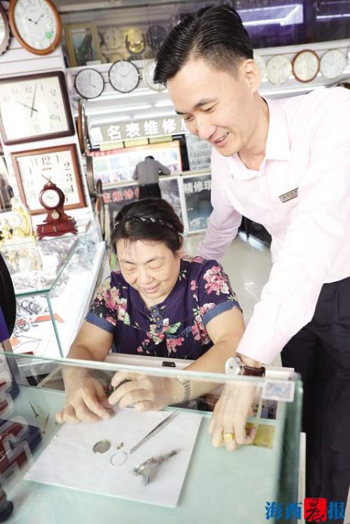 捏着表盘,50岁姜彩云小心翼翼地拿起镊子,在厦门盛昌钟表眼镜有限公司技术总监张祥杰的指导下,把表盘里的零件安好。“成功了!”张祥杰开心地说。
