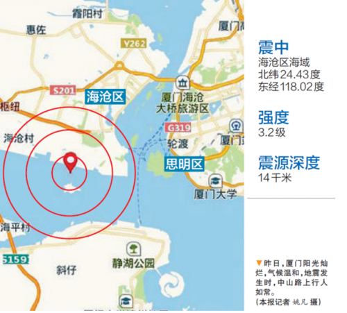 昨日中午11时40分,在厦门市海沧区海域(北纬24.43度,东经118.02度)发生3.2级地震,震源深度14千米。