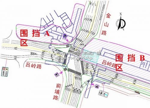 围挡期间,吕岭路与金山路交叉口路口四个方向允许机动车左转,路口采用交通信号灯进行控制。吕岭路与金山路交叉口四个方向均设有过街斑马线,行人和非机动车请通过慢行道及斑马线通行。