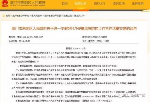 思明区人民政府网站今天发布了《厦门市思明区人民政府关于进一步做好H7N9禽流感防控工作暂停活禽交易的通告》:为预防和控制人感染H7N9禽流感等重大疫病的发生和传播,保护公众健康和维护公共卫生安全,自2016年12月22号起在辖区范围内暂停各类活禽交易。恢复活禽交易日期由区政府另行通知。