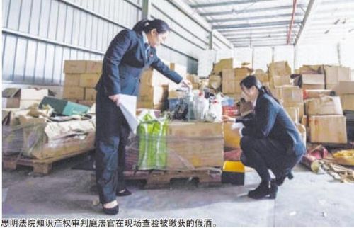 今年7月,黄某杉等19人假冒注册商标罪一案在思明法院知产庭宣判。这个售假团伙将八块钱一瓶的劣质白酒伪装成上百元的金门高粱售卖,账上的成交额就高达上千万元。
