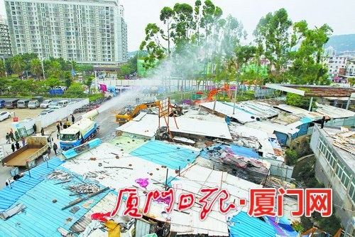 24日,是这一处乱象的“终点”。此前,绝大多数经营户已主动把物品清空。当天8点整,两台大型机械同时进场,拆除行动拉开了序幕。简易搭盖的铁皮、彩钢板、石棉瓦在钩机钻头下,扭曲变形而后倒下,思明城管及时组织工人对破拆后的碎片进行清理,一旁还有大型雾炮车喷出阵阵水雾,及时降尘。拆除行动有序进行着。
