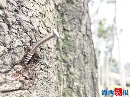 思明区园林绿化管理中心中山公园管理所的相关负责人表示,据不完全统计,整个公园内几十棵树惨遭“钉刑”,都是个别来晨练的人钉上去的。“之前我们工作人员看到时,会拿钳子把钉子拔掉,但过后又有人会钉上去。如此反反复复,无疑增加对树木的伤害,所以我们现在也不怎么敢再拔钉子。”