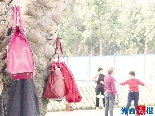 昨天上午8点多,记者来到中山公园内一健身小广场,不少市民在此晨练,现场颇为热闹,一些衣服、包包、雨伞等物品则“长”在树上,随风摇摆。