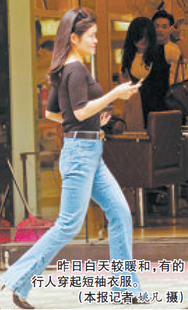 昨日白天较暖和,有的行人穿起短袖衣服。
