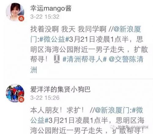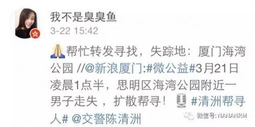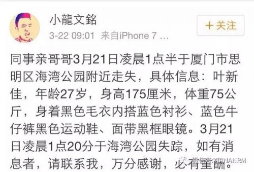 3月21日凌晨1点20分于厦门海湾公园失踪,广大网友如有任何消息,请第一时间报警或者联系小叶 18030040979