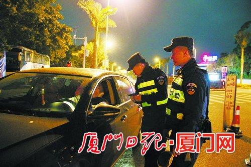 2月28日晚上11时许,在长浩路与长虹路交界处,湖里公安分局巡特警反恐大队设卡盘查。
