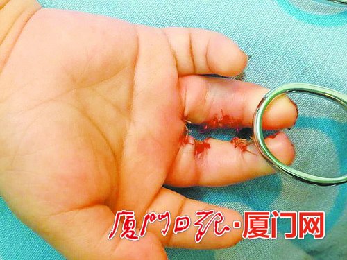 终于,孩子4个月大了,可以手术了。经过多方联络,黄先生抱着孩子,慕名来到厦门莲花医院莲河总院。骨科主任冯健翀对小家伙进行了初步会诊,发现孩子右手无名指掌侧及背侧皮肤相连,无名指均可触及各节指骨,指间及掌指关节活动正常,末梢血运良好。16日,宝宝终于手术了,主刀的冯健翀等医生一点点将孩子中指和无名指的并指进行分离,并重建指蹼。经过40多分钟“奋战”,手术非常成功,孩子右手外形和功能基本恢复正常。(文/图厦门日报记者廖闽玮通讯员李燕瑜)