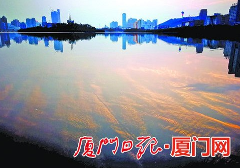 昨日傍晚6点多,晚霞映衬下的筼筜湖水和天上云彩连成一片,仿佛一幅美丽的山水画。