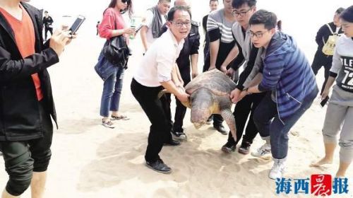 一只100多斤重的红蠵龟在厦门环岛路沙滩被发现。很遗憾,这只海龟已死亡超过三天了。专家表示,红蠵龟大多生活在我国的南方海域,厦门海域并不是它最适合生存的海域,所以平时很少见。我们宁愿相信,这只海龟的死亡是因为自身寿命、意外事件或者生物链上的因素,而非人为的捕捞作业和环境的污染导致。厦门作为海滨城市,中华白海豚、文昌鱼等诸多珍稀海洋物种,就生活在我们身边的海域里。善待它们,保护它们,也是对我们这座城市的爱和呵护。
