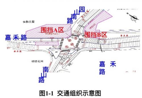 施工期间,嘉禾路、南山路与园山南路交叉口四个方向禁止机动车左转,限制车辆请提前通过周边路网绕行,路口采取交通信号灯进行控制。其中,西进口(南山路由东往西方向)设置2直行+1右转3条车道;东进口(园山南路由西往东方向)设置2直行+1直右3条车道;南进口(嘉禾路由南往北方向)设置3直行+1右转4条车道;北进口(嘉禾路由北往南方向)设置3直行+1右转4条车道,过往车辆根据交通标志、标线及交通信号灯指示通行。