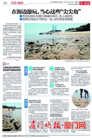 王先生经常到白城海域游泳,他对白城沙滩的“变化”感到忧心,“这里原来是一片很美丽的沙滩。”他说,如今,一些施工单位遗留下来的钢筋、竹筒、乱石,被深埋在沙里没有处理,影响美观又不安全。王先生告诉记者,尤其在涨潮时,这些“杂物”被海水淹没,市民游客很容易被划伤。