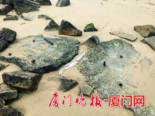 记者在现场看到,滨海栈道下有几处石堆,有的石头尖头朝上。在其中一块石头上方有四个铁柱,长10厘米左右,约有一个硬币粗。在这堆石头不远处,四个竹筒插在沙滩中,用手无法拔出。涨潮后,这些石头几乎都被海水淹没。
