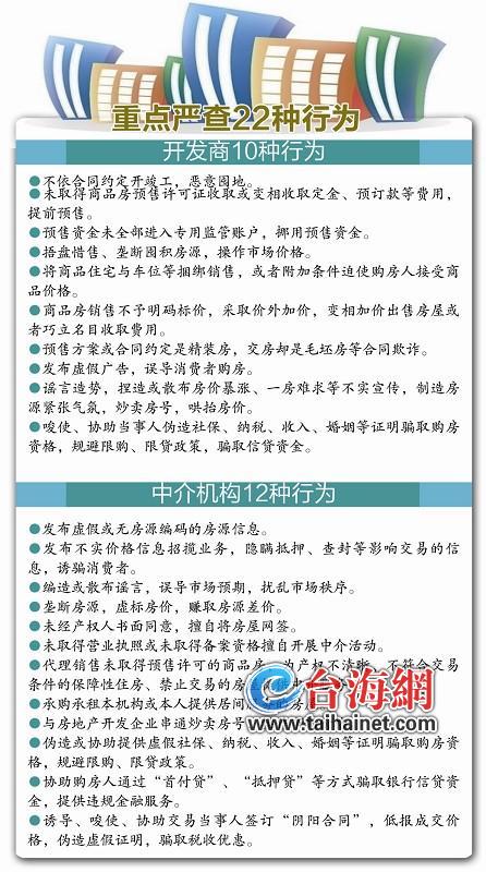 从4月5日起,厦门市国土房产局等9部门将开展整顿规范房地产开发销售和中介行为专项联合执法行动,对房地产开发企业和中介机构的22种行为重点严查。