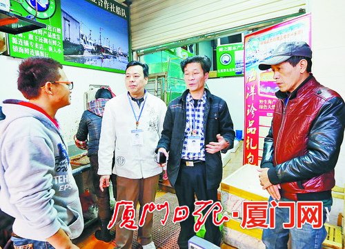 鹭江街道开禾市场调解人员为商户做思想工作。