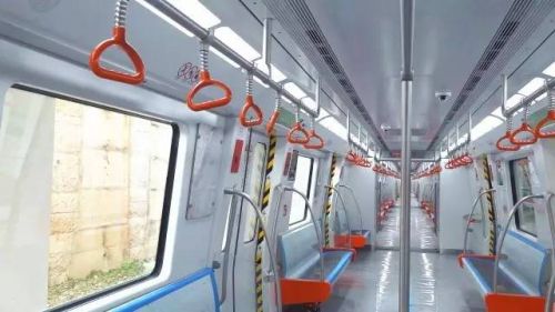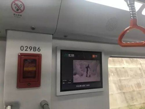 车厢内宽敞、明亮,内饰主色调为橙红色,车内的显示屏内播放着录播视频。