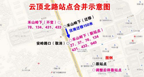 1、调整27路、37路、78路、134路、940路改停迁移后的禾山岭下站(往机场方向站点)。