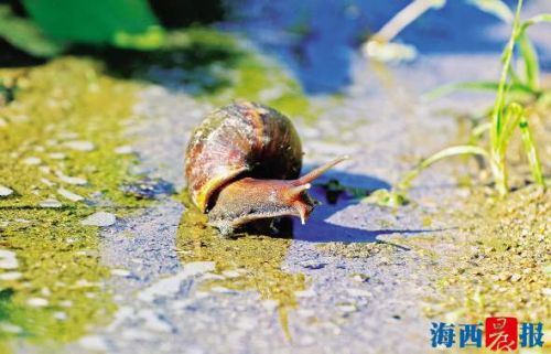 一只蜗牛在湿地里觅食。记者 陈理杰 摄