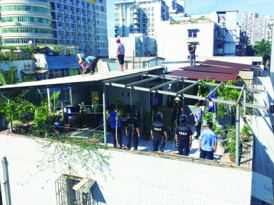 思明城管执法人员正组织工人拆除屿后北里的楼顶搭盖。 王冠群 摄