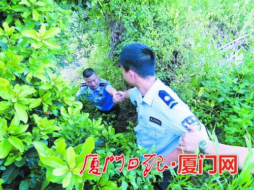 民警赵文从陡坡降下,进行动态排查。