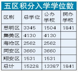 思明、集美、海沧、同安和翔安都公布了积分入学学位(见附表)。湖里区预计今天公布。