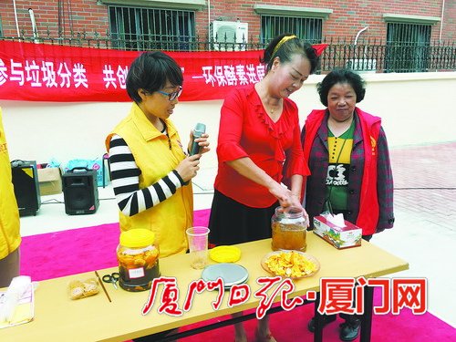 党员陈嫦娥指导居民制作环保酵素。(图/鼓浪屿街道提供)