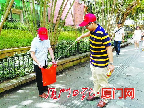 鼓浪屿街道机关支部党员清理路面垃圾,参与文明创建。