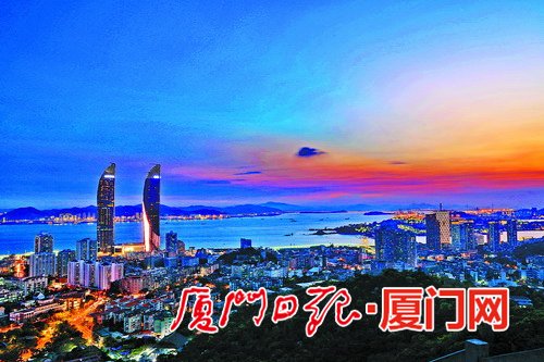 夕阳余晖,华灯初上的厦港片区。(记者 王协云 摄)