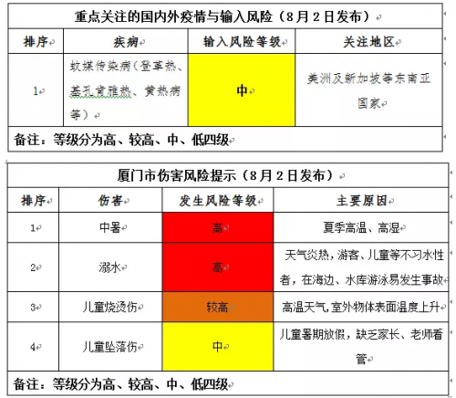 今天上午,厦门市疾控中心发布了8月健康预警报告。根据厦门市传染病和突发公共卫生事件监测数据,结合国际国内传染病疫情动态,经过专家会商评估,预计未来一段时期,厦门本地需特别关注的传染病为:手足口病/疱疹性咽峡炎、水痘、流行性感冒、猩红热和恙虫病;重点预防食源性疾病(食物中毒)包括:微生物性食物中毒、有毒动植物及毒蘑菇中毒;重点预防登革热等蚊媒传染病输入性疫情;重点预防伤害:中暑、溺水。