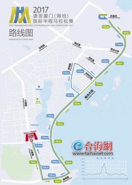 具体比赛路线为:起点:兴港路(与角嵩路交叉口前)→建港路→海沧大道→拥军路口前(折返点)→海沧大道→沧林东路→滨湖路→海沧大道→建港路→终点:兴港路(与角嵩路交叉口前)。