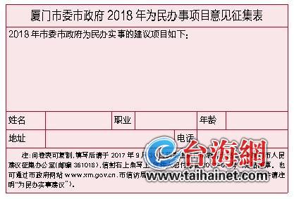 2018年度厦门市委市政府为民办实事项目建议开始征集了,从即日起至9月30日止,市民可通过纸质信件、电子邮件的方式,提出自己的相关建议。