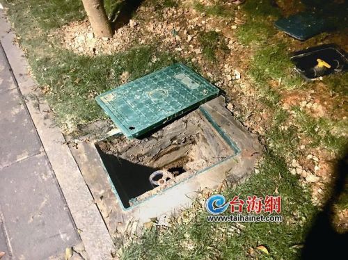 当晚8点多,导报记者来到金尚路虎头山公园对面的路边看到,绿化带上有个绿色井盖打开了,井口呈长方形状,深约40厘米,里头有一个蓝色的阀门。而打开的井盖则放在一旁。