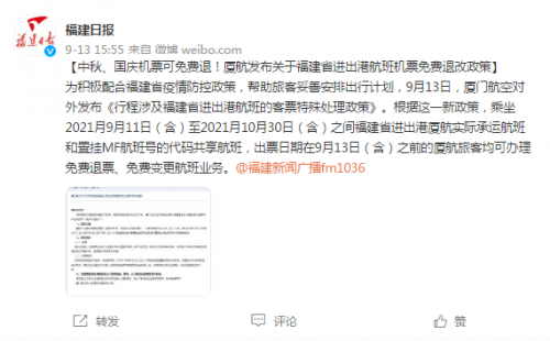 为积极配合福建省疫情防控政策,帮助旅客妥善安排出行计划,9月13日,厦门航空对外发布《行程涉及福建省进出港航班的客票特殊处理政策》。根据这一新政策,乘坐2021月9月11日(含)至2021月10月30日(含)之间福建省进出港厦航实际承运航班和置挂MF航班号的代码共享航班,出票日期在9月13日(含)之前的厦航旅客均可办理免费退票、免费变更航班业务。